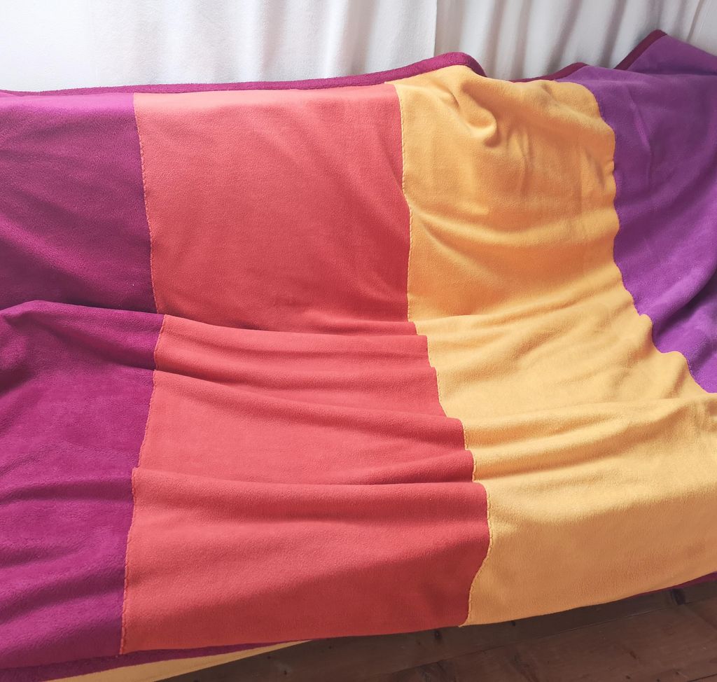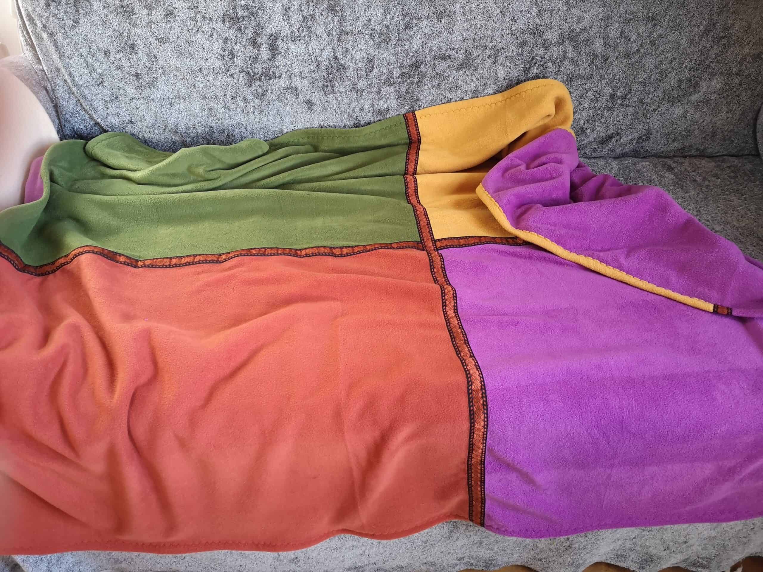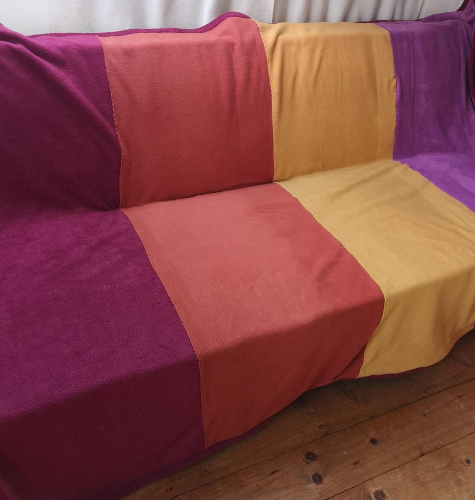 The Blanket has 4 colours on the front, and one colour on the back. This double Fleece Blanket, gives super Fleece Warmth, so cosy! Folded, it also adds a dash of colour to your space.