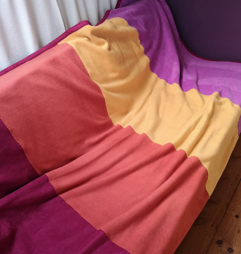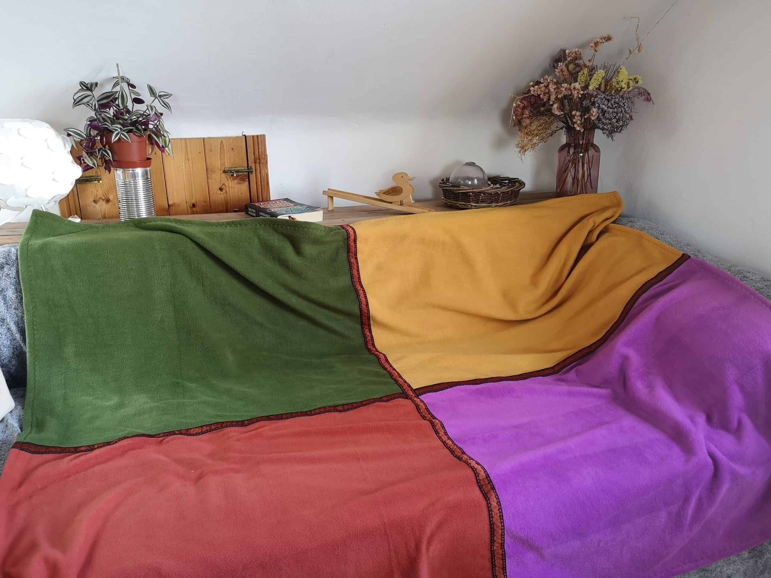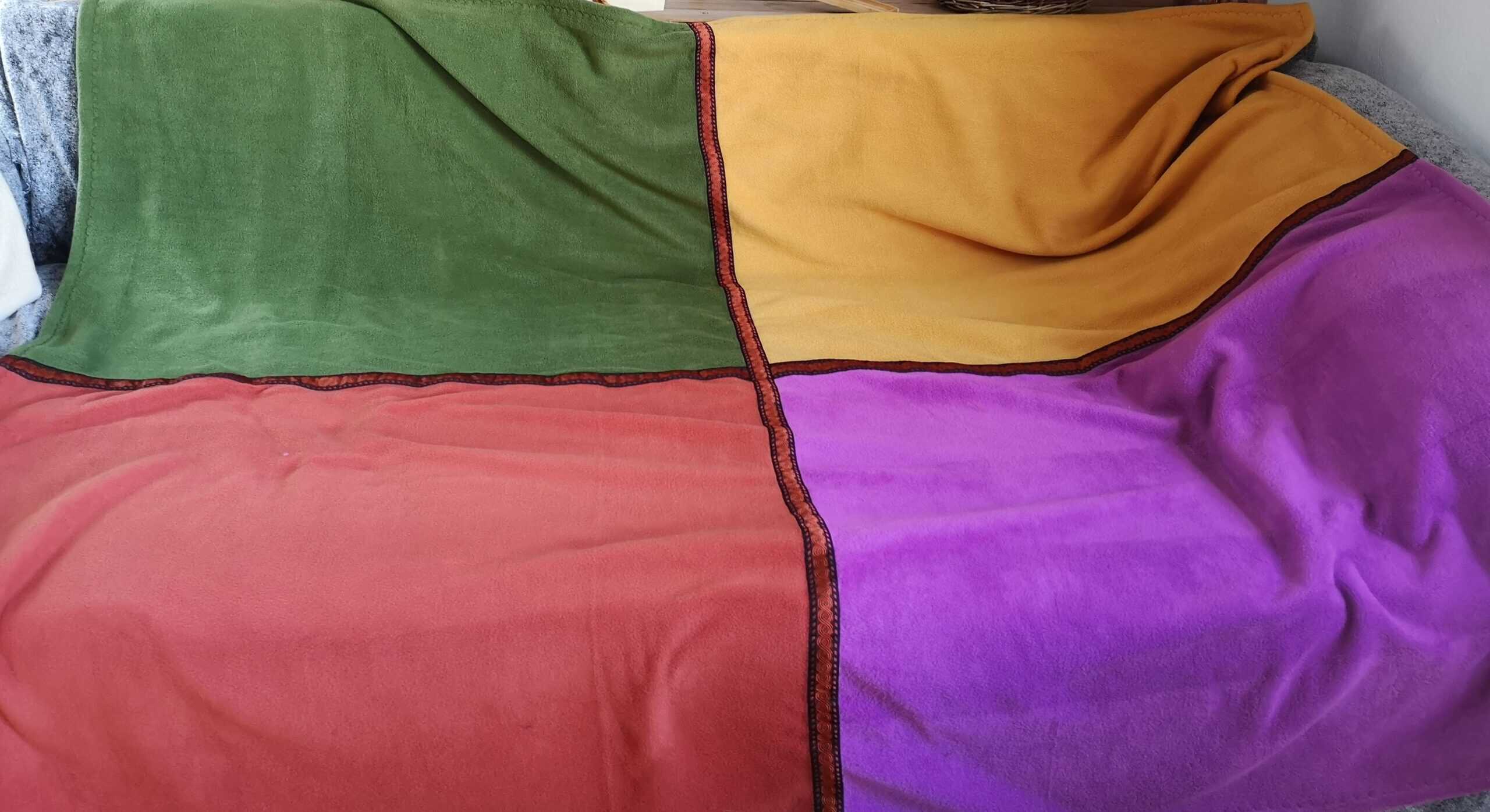 The Blanket has 4 colours on the front, and one colour on the back. This double Fleece Blanket, gives super Fleece Warmth, so cosy! Folded, it also adds a dash of colour to your space.